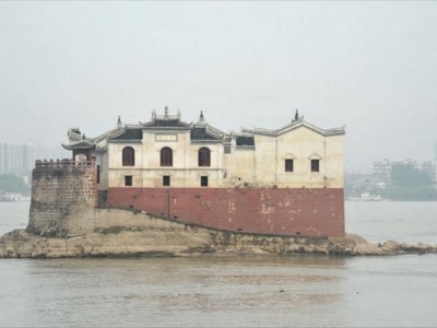 每到汛潮,水漫楼阁,只剩高层窗口,甚至只剩那檐牙、龙吻、中亭在浩淼长江水之中。汛期一过,水落石出,它又横空出世,威镇江心。