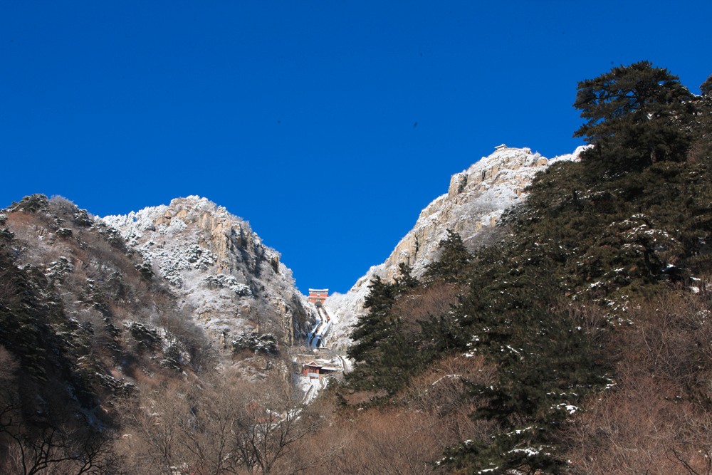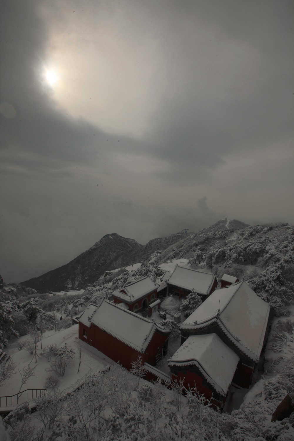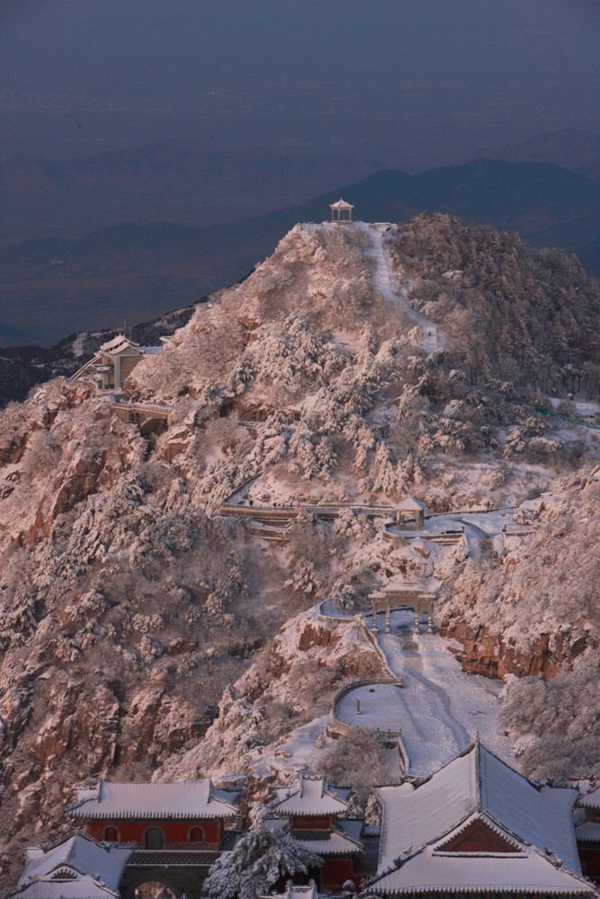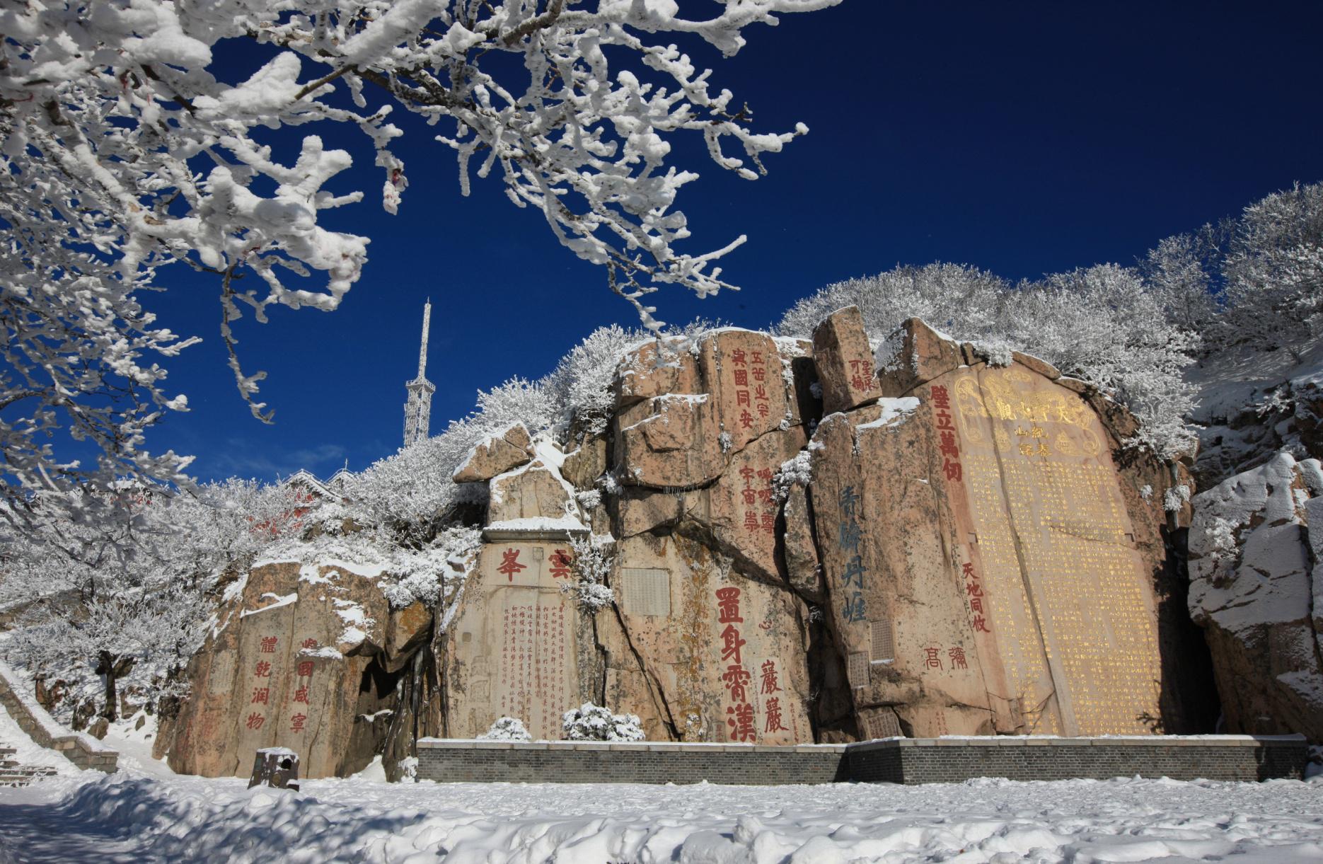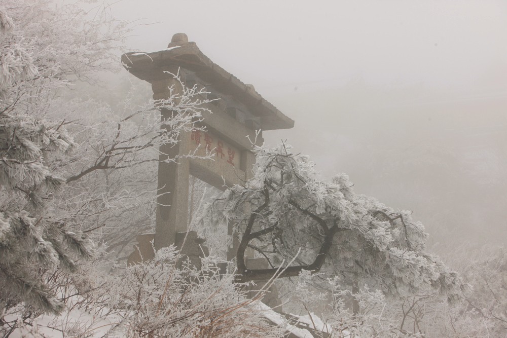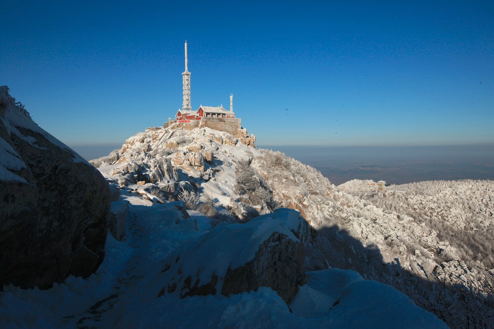 玉皇顶位于碧霞祠北,为泰山绝顶,因峰顶有玉皇庙而得其名。赵琛教授拍摄的这张照片中,前方巨石的阴影将阳光下的玉皇顶衬托得愈加明亮,呈现出一片光明,熠熠生辉之景。这里是历代帝王登顶封禅之地,白雪无法掩映其光芒,冰雪中的玉皇顶愈有威震四方的大家风范。