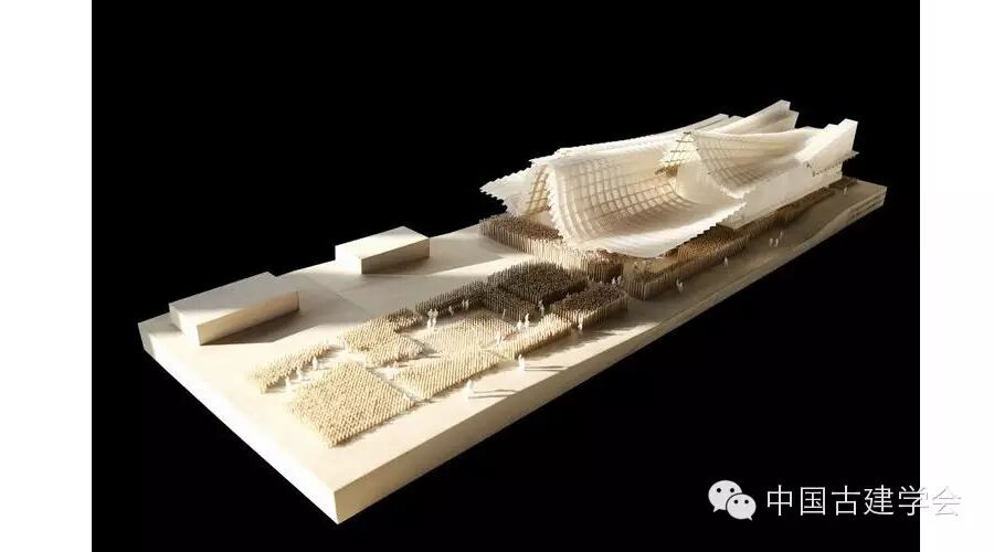 米 兰世博会中国馆的主建筑正立面,是整个建筑流线最高潮的部分——高耸的胶合木结构屋架,宛如“群山”造型。设计师以满腔激情,向中国传统的抬梁式木构架屋 顶致敬,也为观众提供了可以纪念留影的巨大空间。