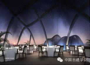 中 国馆的建筑外形提取了传统歇山式屋顶的造型元素,从空中看,如同希望田野上的一片“麦浪”;从正面看,如同自然山水的天际线;从背面看,又象是城市的天际 线。